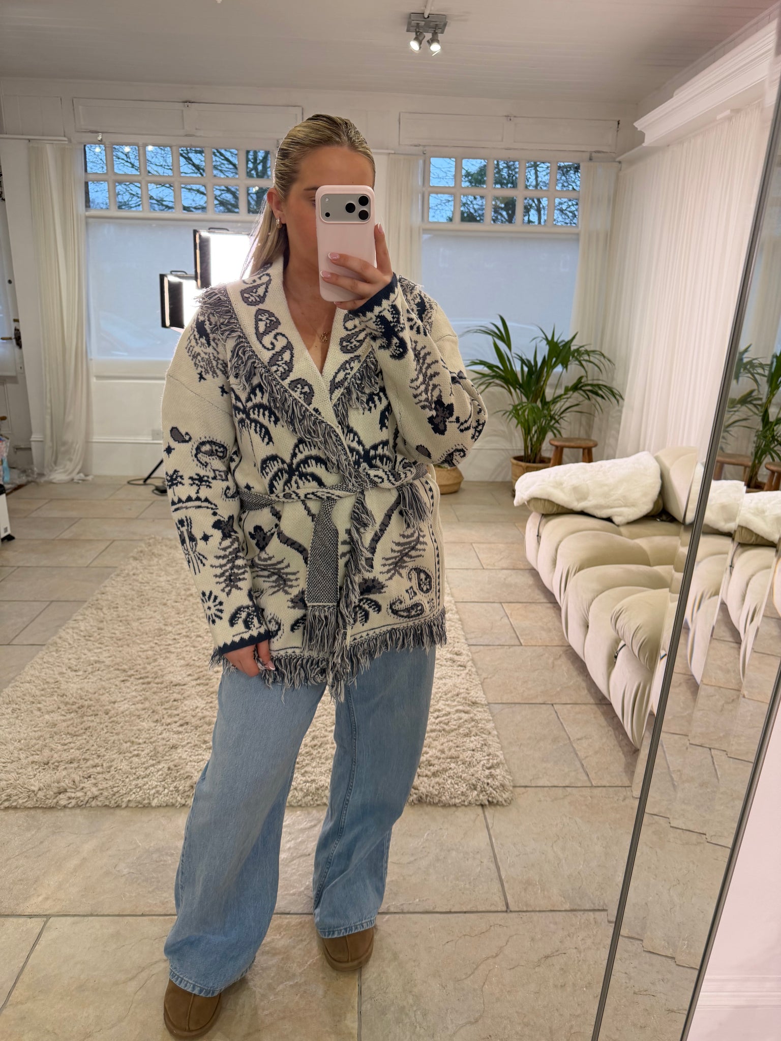 The Emilia - Cardigan features a tassel lapel and chunky premium knit construction, providing warmth and comfort. The fringe design adds a stylish element, suitable for layering in cooler temperatures. This piece balances fashion and function, making it a versatile addition to any wardrobe.