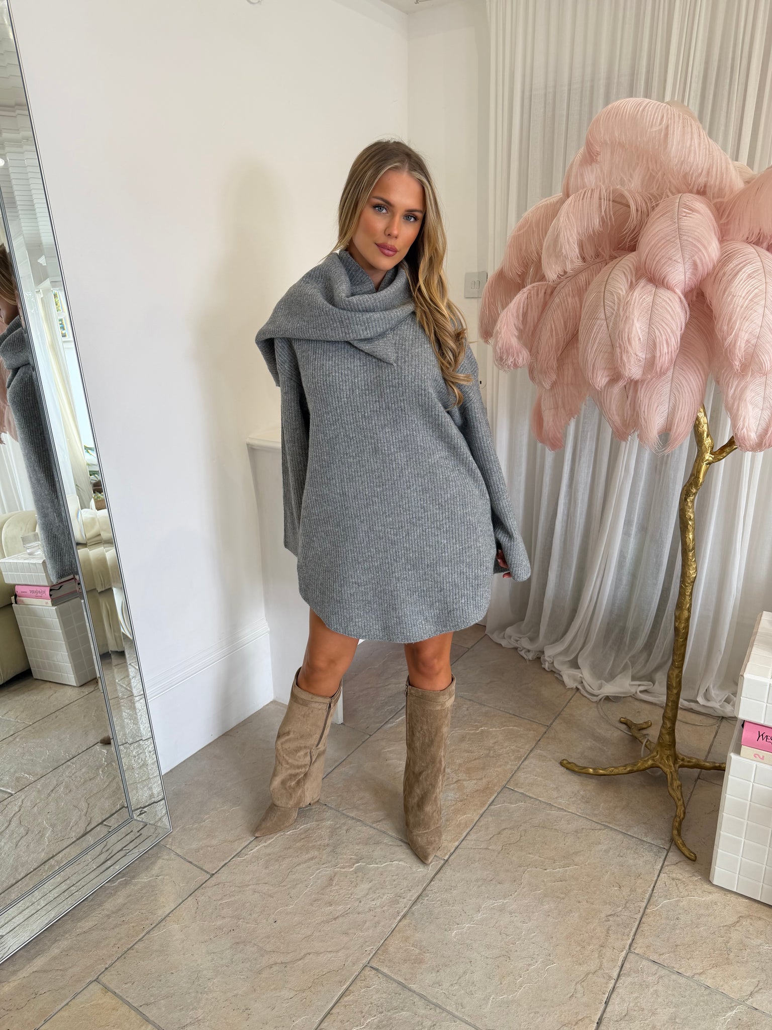 The Holly - Grey jumper features a long v-neck design with an oversized fit. It also includes a built-in scarf for added warmth and style. Transform this versatile jumper into a dress by pairing it with a skirt or shorts. Stay cozy and fashionable with Holly.
