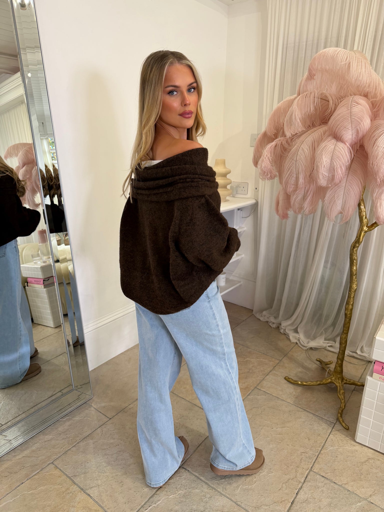 Stay on-trend and cozy with Remi's cream-colored ring off shoulder Bardot soft knit jumper. Made with soft knit fabric, this stylish jumper effortlessly combines comfort and style. Perfect for any occasion, this versatile piece is a must-have for your wardrobe.